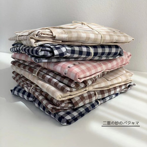 日式无印家居服纯棉双层纱睡衣女 简约格子无侧缝套装春秋款长袖