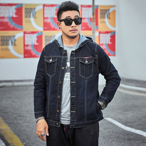 大码男装弹力修身连帽牛仔夹克潮加肥加大外套胖子上装宽松带帽衣