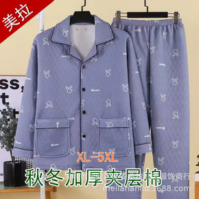 男秋冬男士睡衣三层薄夹棉中老年开衫加厚夹层棉宽松家居服套装