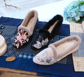 加绒毛边尖头鞋 绣花布鞋 时尚保暖家居鞋 民族风女鞋棉拖女棉鞋