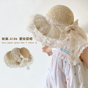 秋南 儿童帽子夏季韩版新款女童蕾丝大檐渔夫帽宝宝遮阳帽草帽