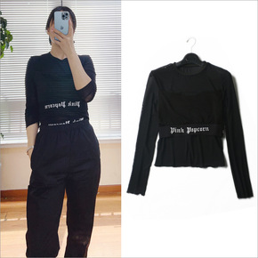现货杨同款黑色网纱透明长袖T恤女上衣内搭打底冰袖防晒衫