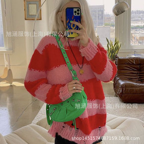 21AC女装秋季新款马海毛明星同款破洞条纹薄款圆领毛衣镂空针织衫