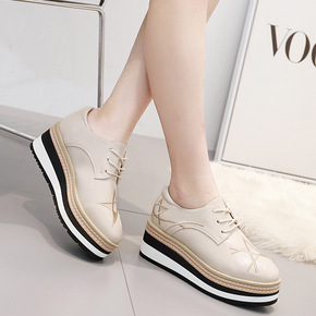 韩版2022秋季条纹底绑带圆头厚底松糕内增高坡跟单鞋女休闲英伦风