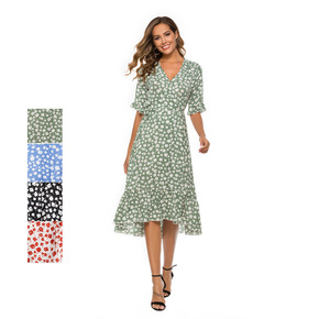 跨境沙滩裙2022春夏新款雪纺印花荷叶边大摆连衣裙法式裹身裙长裙