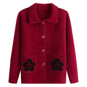 中老年女冬装翻领毛衣短外套中年妈妈款春秋装仿水貂绒上衣服洋气