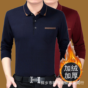 秋冬中年爸爸装长袖T恤男时尚翻领真口袋加绒加厚针织打底衫男装