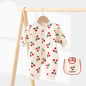 女宝宝春秋长袖纯棉连体衣3-18个月卡通小樱桃公主风配口水围爬服
