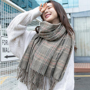 冬季仿羊绒围巾女韩版时尚杨幂同款秋冬格子拼色保暖围巾围脖披肩