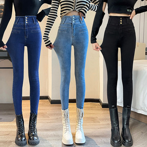 2022年春秋三粒扣高腰收腹牛仔裤女显瘦显高紧身弹力网红小脚裤子
