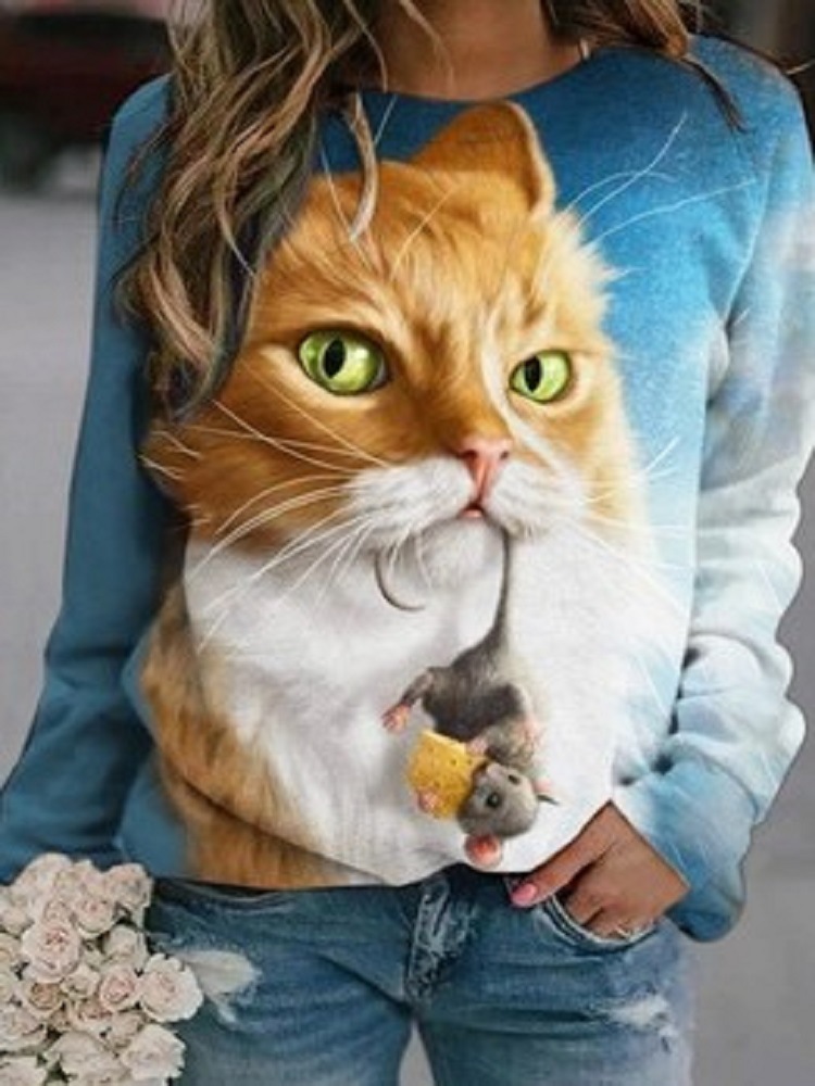 #2020外贸跨境时尚女装宽松圆领动物猫咪3D数码印花卫衣9038