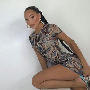 欧美新款女装eBay夜店性感透视网布印花连衣裙褶皱包臀短裙 15577