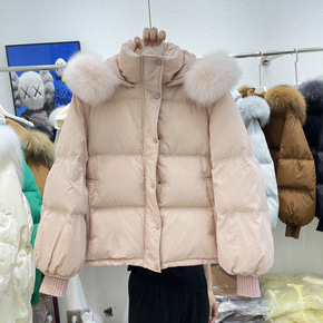 东大门大狐狸毛领白鸭绒连帽羽绒服女短款冬季宽松面包服外套