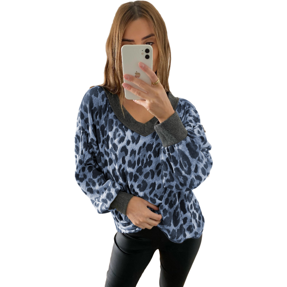 2020亚马逊跨境女装秋冬热卖欧美V领长袖套头豹纹卫衣T恤上衣女