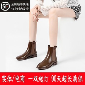 2022秋冬新款小香风皮带短靴女圆头粗跟平底女靴英伦风切尔西短靴