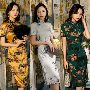 红眸2022春款新款仿花罗旗袍连衣裙三分袖中长改良侧八扣双层旗袍