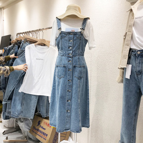 韩国2022春夏季新款女装韩版蓝色单排扣吊带显瘦中长款牛仔连衣裙