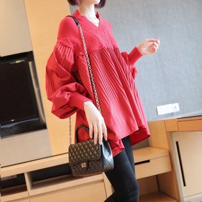 v领打底衫女韩版套头2021年春季洋气灯笼袖毛衣中长款宽松针织衫