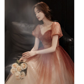 红色敬酒服2022秋冬新款仙气名媛生日渐变色法式长款宴会晚礼服