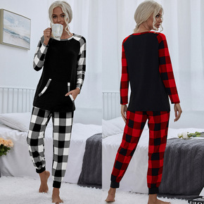 2021秋冬新款亚马逊欧美跨境女装时尚格子圆领家居休闲宽松套装女