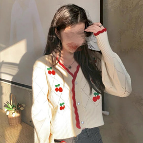 2022年春秋爆款针织开衫 日系复古减龄红樱桃刺绣短款毛衣外套
