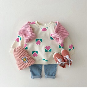 韩版秋款童装女童新秋装撞色花朵卫衣男女儿童宝宝套头上衣潮