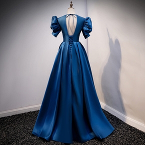 高档宴会晚礼服裙女2022新款蓝色重工气质指挥大合唱泡泡袖演出服