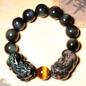 志诚天然彩虹眼黑曜石歪头貔貅手链男女士款加黄虎眼石手串双皮休