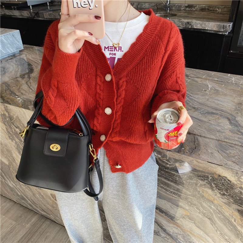 韩国气质V领开衫毛衣女外套2021秋冬新款时尚纯色针织衫镂空上衣