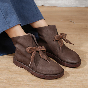 清仓马丁靴新款头层牛皮短靴女 圆头软底现货女鞋松紧蝴蝶结靴子