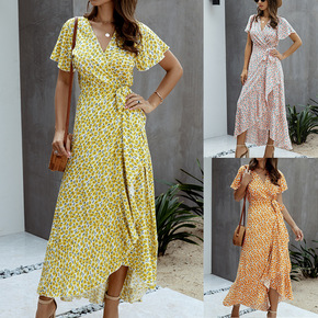跨境欧美女装2022夏季新款时尚波点性感V领荷叶边短袖连衣裙女