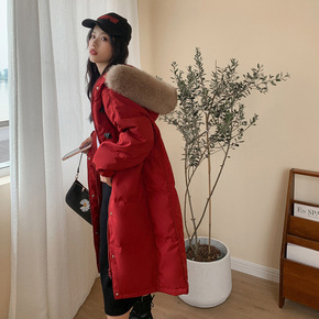 2021新款冬季中长款大毛领加厚白鸭绒冬季过膝连帽粽子款羽绒服女