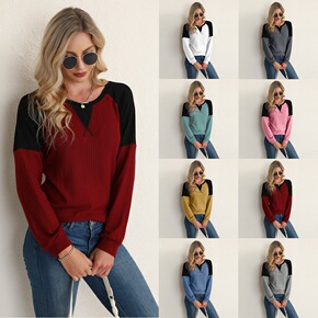 2021跨境欧美女装亚马逊独立站热销华夫格毛衣圆领拼接长袖上衣