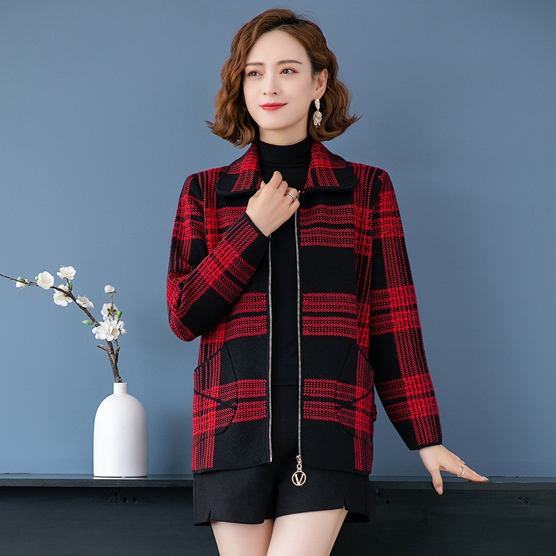 秋装2021年新款针织开衫秋冬翻领外套女士中长款宽松外搭格纹毛衣