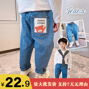 优优之家童装新款2022男童长裤春秋季韩版休闲儿童小熊印花牛仔裤