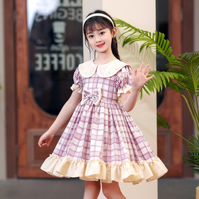 女童夏季格子连衣裙韩版长袖娃娃领蝴蝶结中大童洛丽塔蓬蓬公主裙