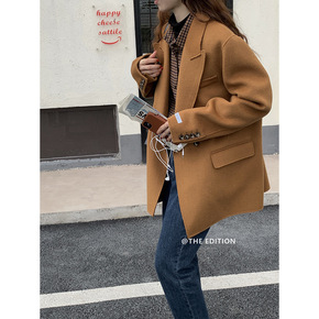 韩版双面羊绒大衣女新款一粒扣毛边西装领中长款毛呢外套