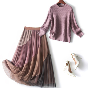 欧列拼接设计网纱套装裙2022秋季菱形针织T恤半身裙两件套60604