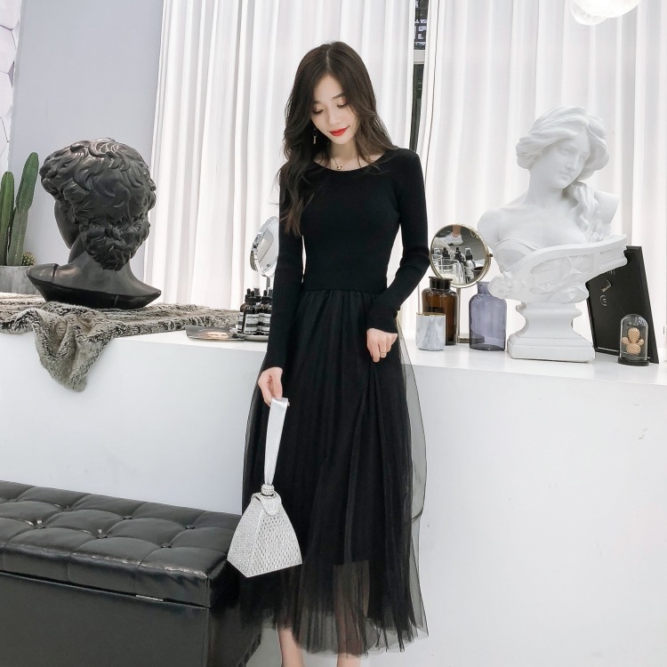 2022秋冬女装长袖早秋针织连衣裙网纱裙慵懒风小清新毛衣女甜美