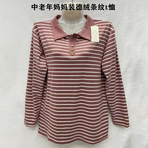 2022中老年女装春季大码德绒长袖条纹t恤妈妈装翻领上衣打底衫