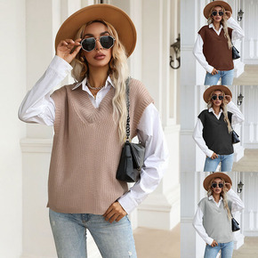 2022跨境新款秋季纯色v领针织毛衣通勤简约无领马甲背心欧美女装