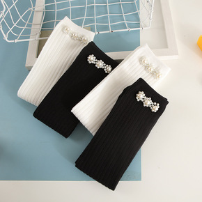 珍珠袜子女童可爱潮袜白色条纹小腿袜纯色lolita黑色中筒袜 春秋