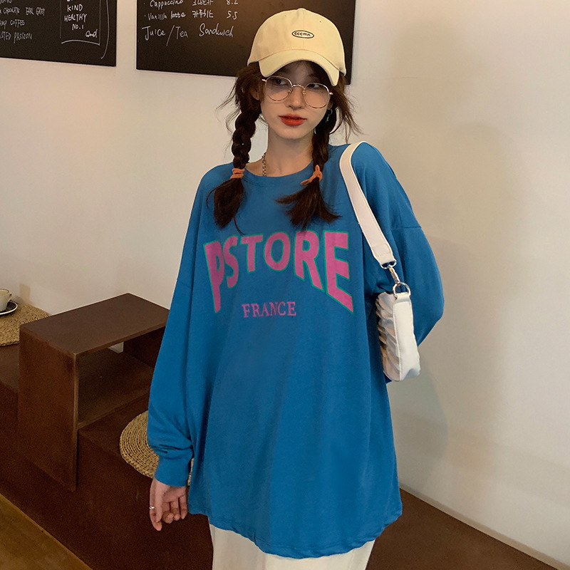 2021秋季韩版字母印花宽松BF风圆领长袖卫衣女中长款打底衫上衣潮