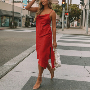 欧美2022新款缎面提花中长裙跨境吊带荡领度假风豹纹性感连衣裙