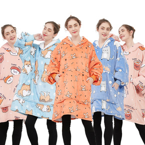 韩版家居休闲服大码卫衣女连帽懒人毯法兰羊羔绒双层加绒卫衣跨境