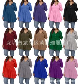 2021亚马逊eBay欧美外贸秋冬新款V领纽扣褶皱女士纯色长袖大码T恤