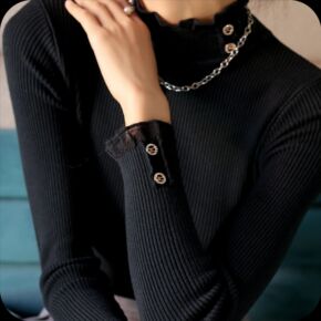 2022木耳边针织打底衫春秋冬季内搭女黑色百搭半高领长袖洋气上衣