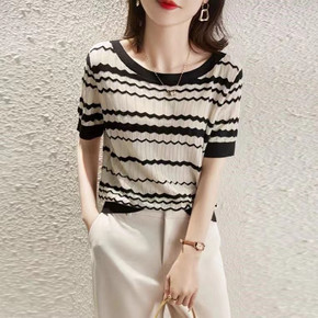 爆款新款撞色波浪条纹针织衫女夏季薄款圆领提花镂空打底短袖女