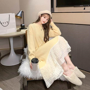 温柔风甜美仙女蕾丝边连衣裙秋冬慵懒风大码胖MM中长款针织毛衣裙