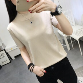 2022夏款冰丝针织短袖女T恤衫宽松上衣圆领套头纯色打底衫女薄款